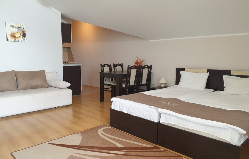 Обновените студиа в централната сграда предлагат комфорт и удобство с директен достъп до основните съоръжения на комплекса. Те са разположени в сградата, в която се намират ресторантът, вътрешният басейн и релакс зоната. Всяко студио разполага с оборудвана кухня, антре и обновена всекидневна с мека мебел и телевизор, спалня с две отделни легла, както и функционална баня, осигуряваща необходимото удобство за престоя на гостите.