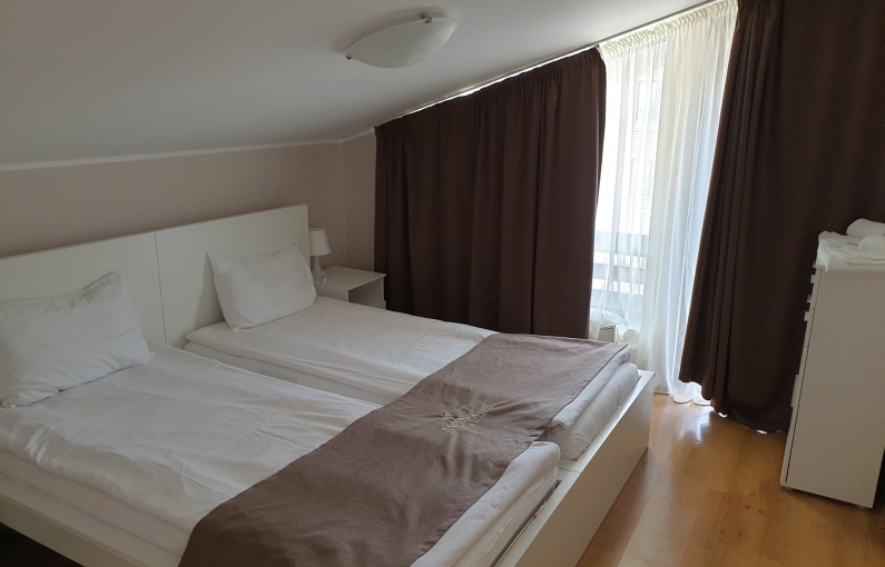 Обновените двуспални апартаменти в централната сграда предлагат простор и комфорт, както и удобен достъп до основните съоръжения на комплекса – ресторант, вътрешен басейн и релакс зона. Апартаментът разполага с оборудвана кухня, антре и обновена всекидневна с мека мебел и телевизор, функционална баня, както и две отделни спални – едната с две отделни легла, а другата с голямо двойно легло (king